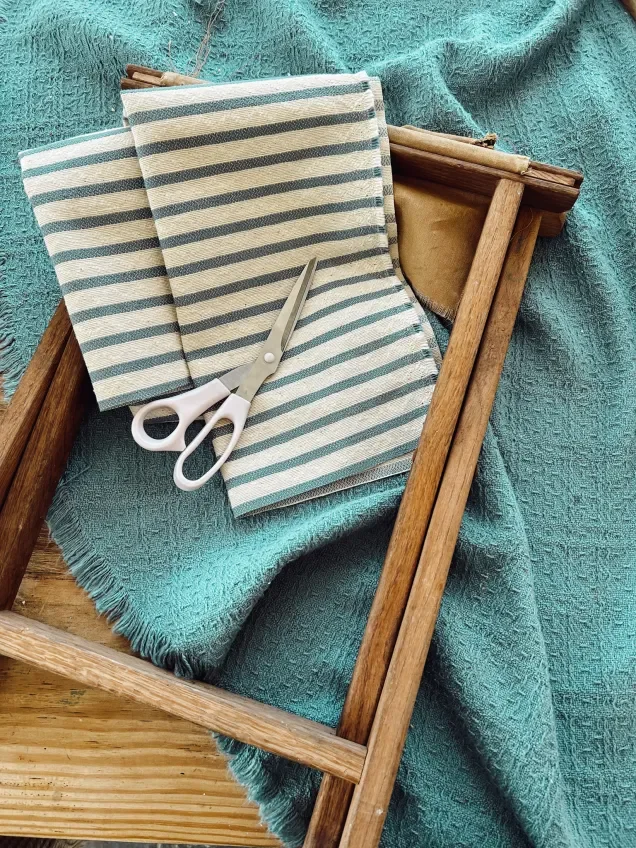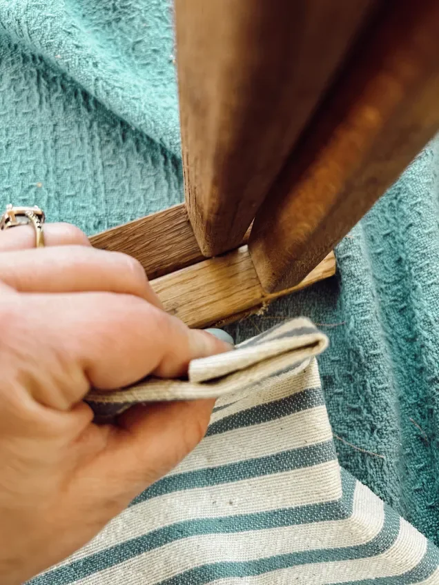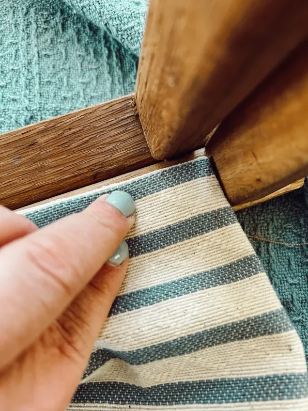 I had some fabric that I had picked up on a past thrift trip that I thought would be perfect for this project. It’s a creamy white upholstery fabric with a thick blue stripe. So I did some quick eye measuring for how wide I wanted the stool to sit. Then I cut down the fabric. This was a simple project; all I needed was fabric and a staple gun. I just folded the ends of the fabric under, wrapped them around the top of the stool, and stapled them. This whole project probably took me less than 15 minutes.