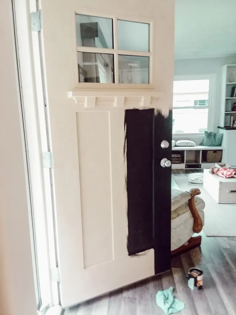 But with doors like these, they come unfinished. You can either stain them or paint them. I went back and forth for a while and did a lot of Pinterest scrolling for red brick homes for some front door inspiration. I finally landed on black. We could have done a pop of color, but because of a few other things, I wanted to incorporate this felt like the best option. I decided to try gel stain. I had heard good things about gel and that it was pretty user-friendly.