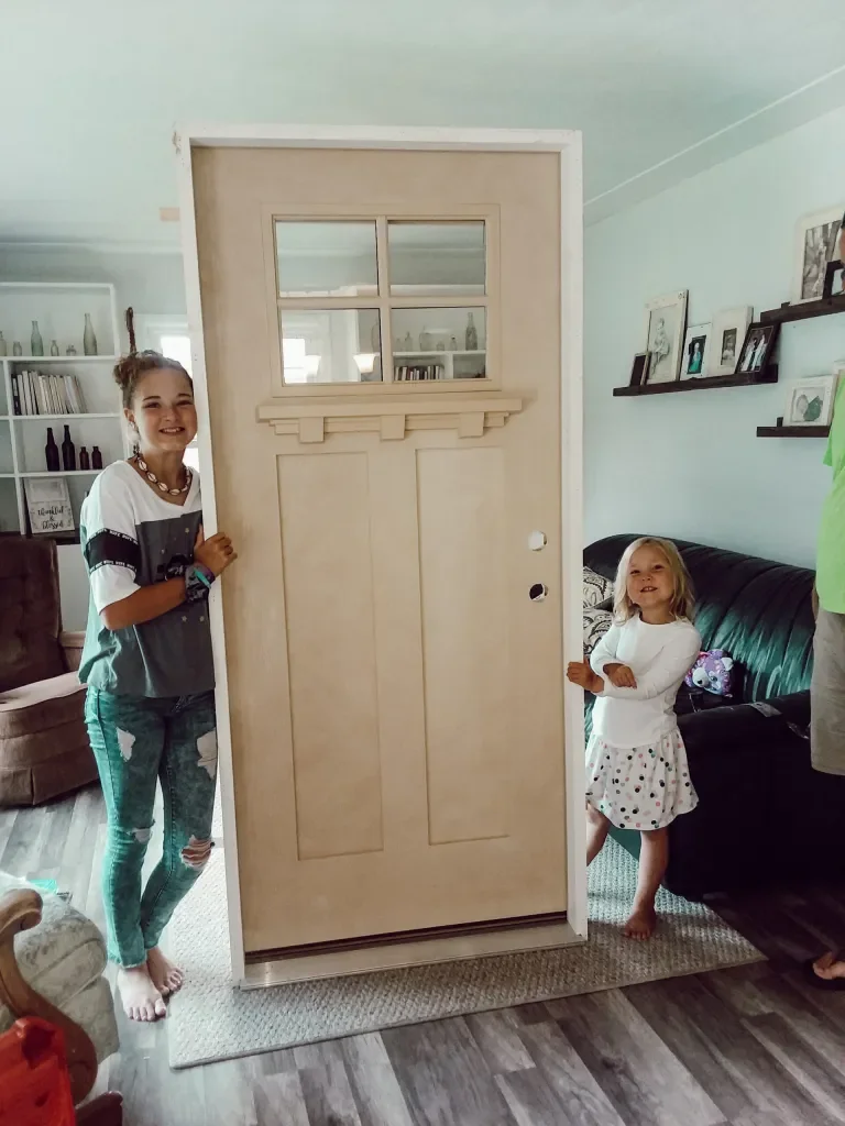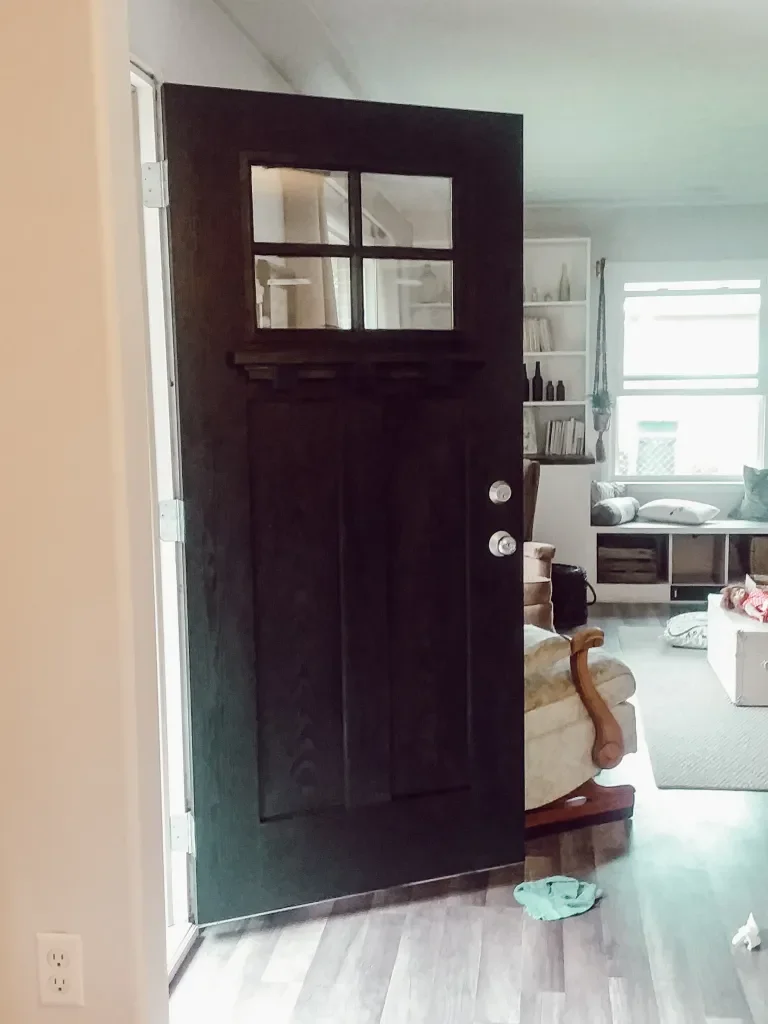 My husband was able to get his hands on this Craftsman-style fiberglass front door for us. I was pretty geeked. This was just the update that the front of our house needed! It also opened the opposite way of our old door, which was perfect because the old one swung open into the room and was in the way when greeting visitors.
