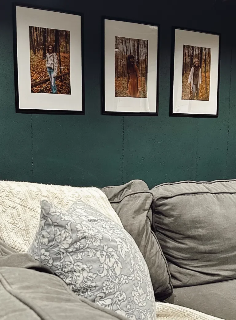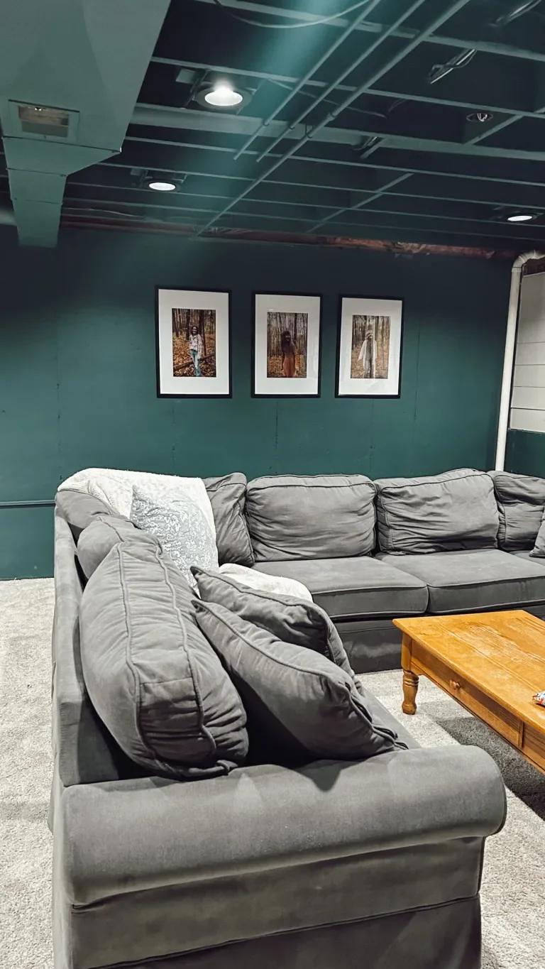 My husband is the sentimental one in our relationship, and he’s always asking for more pictures around our house. So I’ve been trying to make an intentional point to add more framed photos and albums throughout the house. Over the past year and a half, we’ve been working on transforming our unfinished basement into a fun place for the family to gather and watch movies, and play games together. It’s a pretty large room, which means when you’re implementing decor and things, you have to be very intentional that it’s to scale. You can’t add small or medium-sized frames to a large wall.
