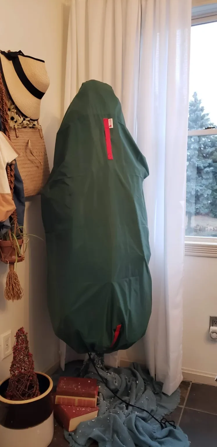 First off, I bought an upright Christmas tree bag. I purchased a 5-foot flocked Christmas tree this year and was concerned about how much of the flocking I would lose over time if I kept packing and unpacking it. I knew I had space to store it if I left it assembled, so I decided to buy a storage bag for it. I haven’t taken it down quite yet, but I’m thinking I might leave the lights on it also. So all I’ll have to do is remove the ornaments, place the bag over it, and that’s done! Sounds like a win to me.