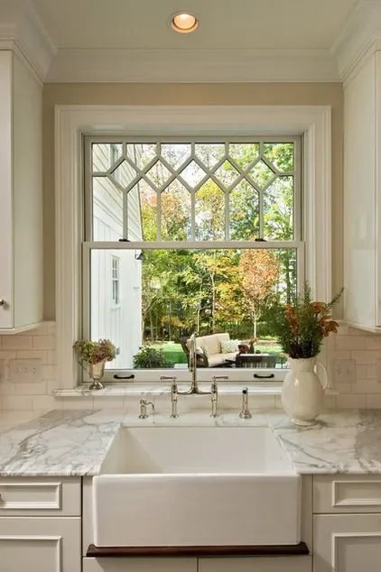 I’m trying to scheme and come up with a creative way to get a faux lead glass look in our kitchen in the same design as the grids in this kitchen. I feel like lead glass windows are so unique and beautiful. I love the idea of the detail on the top pane and nothing on the bottom pane. We have a great view of the pond behind our home, and I’d like to keep a clear view of that.